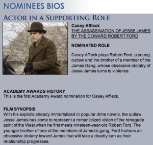 I have actually met and chatted with one of the nominees for Best Actor in a Supporting Role! One year, at the Sundance Film Festival, I was invited to a private party featuring some of my favorite songwriters (Emmylou Harris, Patty Griffin, David Baerwald), who wound up doing their “show” sitting on barstools in the tiny living room of a mountainside condo. And Casey Affleck was one of the actors invited as well. We chatted for a while and learned we were big fans of these same writers.